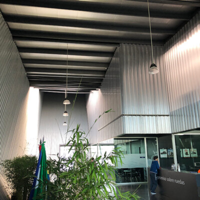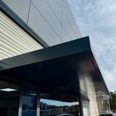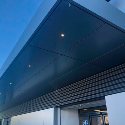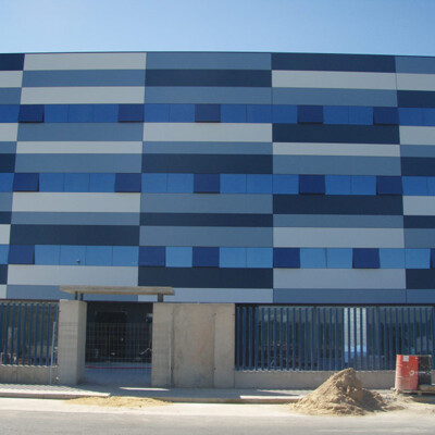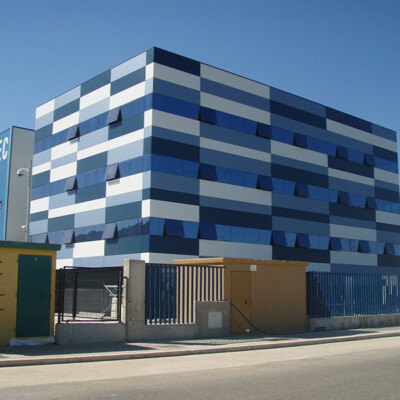 Diseño, desarrollo de soluciones y montaje rehabilitación energética de la envolvente realizada mediante fachada ventilada panel composite de aluminio Alucobond , fachada ventilada en chapa grecada siendo microperforada como protección solar de ventanas, formación de marquesina protección solar, integración de iluminación arquitectónica de fachada, rótulos , y estructura metálica formación de fachada.