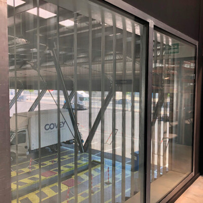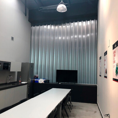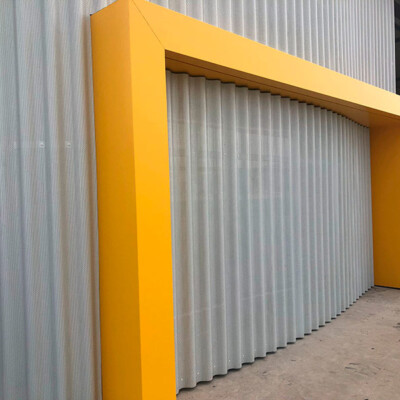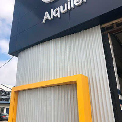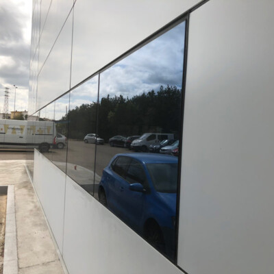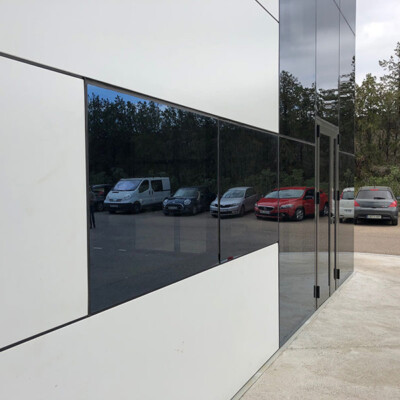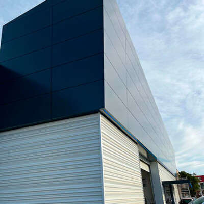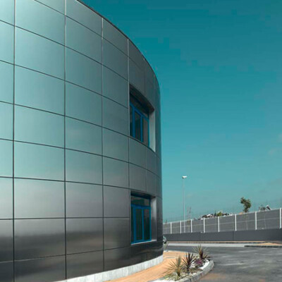 Diseño, suministro y montaje de fachada realizada con panel composite de aluminio Stacbond de Strugal, fachada ventilada chapa grecada , estructura metálica, fachada acristalada mediante perfiles de muro cortina y doble acristalamiento aislante provisto capa de control solar , integración en fachada ventilada de puerta seccional, iluminación arquitectónica de fachada, y marquesina de protección solar.