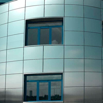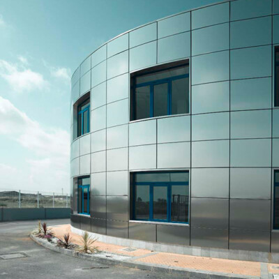 Suministro y montaje de fachada ventilada curva en acero inoxidable brillo, aislamiento térmico y acústico de la fachada, y estructura metálica formación de fachada.
